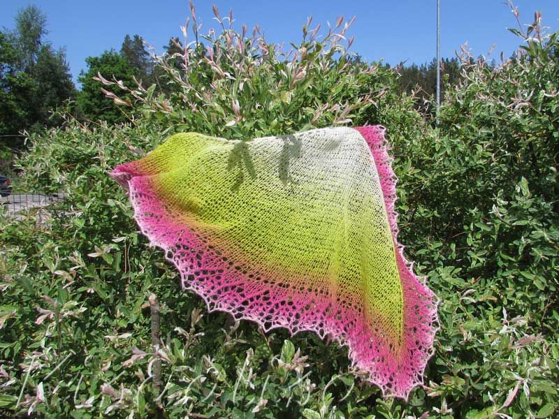 Шаль Фрея с двойной каймой, Кауни Радуга. Сначала казалось, что Радуга будет слишком яркой. Однако, после блокировки цвета раскрылись, контраст сгладился и появилось ощущение праздника. Очень люблю Радугу :) ...